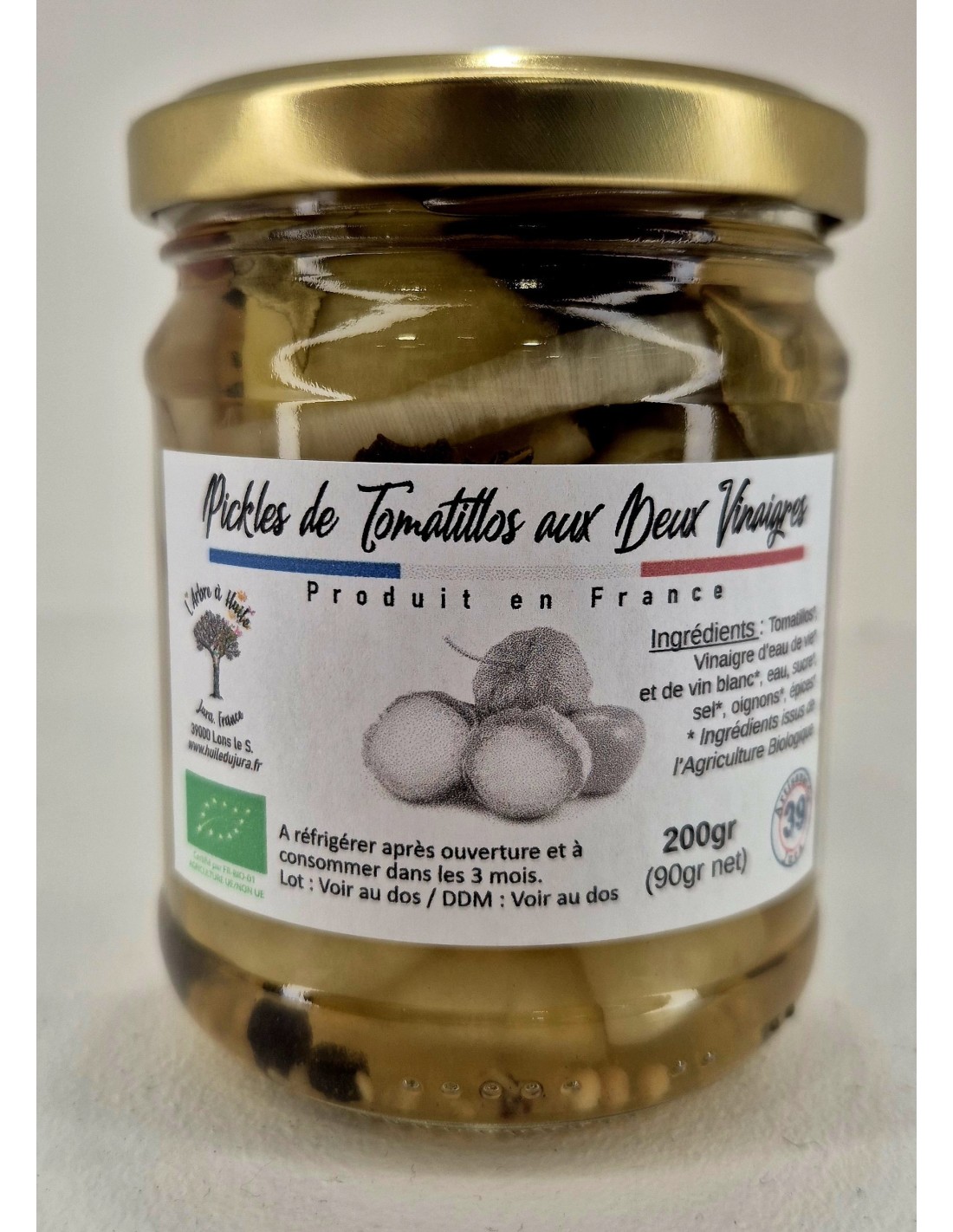 Les pickles de tomatillos bio aux 2 vinaigres L’Arbre à Huile, fabriqués artisanalement dans le Jura, offrent une saveur aigre douce raffinée. Naturels et sans additifs, ils subliment vos plats avec une touche originale et locale.